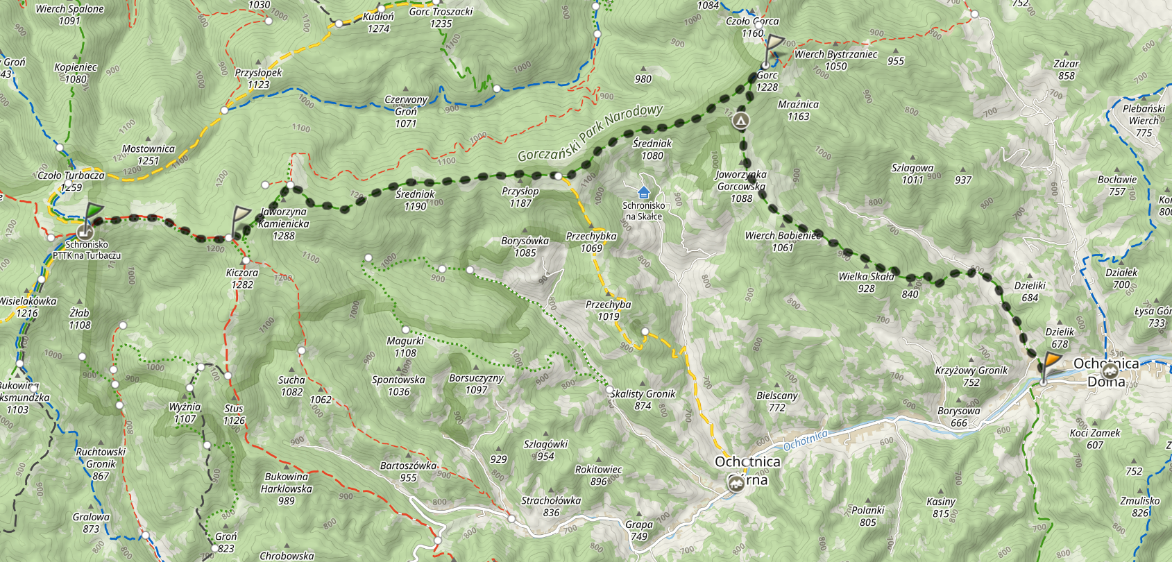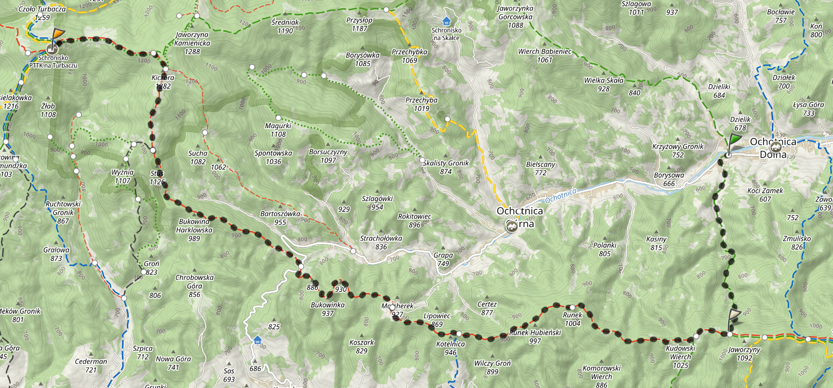 W ten sposób wylądujemy w Ochotnicy Dolnej. Stamtąd rozpoczniemy galop początkowo zielonym a dalej już do samego końca dnia czerwonym szlakiem - do Schroniska na Turbaczu, gdzie zaklepany jest nocleg. Plan na dzień drugi to powrót przez Gorc - zielonym szlakiem. Jak leśne licho pozwoli, to i grzybów nazbieramy. Na pogodę się nie zanosi. W sensie na słoneczną - bo jakaś na pewno będzie. Wyjdzie w praniu. Poniżej wrzucam mapki.